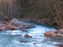 Каякеры стоят в улове между Кишами, а адмирал с Серёгой готовятся к своему прохождению. Задачка нелегкая: если уж каякеры имели проблемы со скалами после слива, то на кате просочиться между ними совсем непросто. Очень непросто, по крайней мере, им это не удается, и среди камней они намертво застревают. Вылезают на камень, поднимают кат, опускают кат. Всей развлекухи минут на десять. А на улице уже свежеет. Но, наконец-то, с дикими матюками (в основном старался, конечно, Захаров) катамаранщики чалятся в наш улов. На очереди Киши-2! Сначала Белокуров, потом Козырев, а потом и я разгоняемся и прыгаем - чисто! Очередь адмиральского ката. Выходит из улова, набирает скорость, слив, ну! В бочку катамаран заходит чуть под углом, но этого хватает: сначала он крутит почти полный красивейший спин, становится на баллон, стоит вертикально несколько секунд и задумчиво с достоинством киляется. Есть первый катамаранный киль! Время на реванш уже нет, скоро стемнеет, пора становиться. Где? Сначала думали остановиться на другом берегу Белой с перспективой покататься по реке Кише. Однако при нашем уровне воды подобные покатушки начисто теряют смысл, да и вещи на тот берег транспортировать лень. Да, забыл сказать, наши шмотки за нами возит нанятый мужик на грузовичке. В итоге едем к началу Гранитного каньона. Стояночка там неплохая, лагерь ставим уже в сумерках. Сегодня пьем спирт, купленный в Гузерипле.