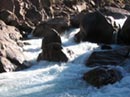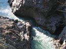 Вот уж сегодня дрочить никак нельзя. Идем Гранитный каньон! По крайней мере, один раз, хотя если понравится, может и повторим. До места старта нас довозит давешний мужичок на грузовичке, за которым Захаров не поленился съездить накануне в Гузерипль. Вопрос номер раз: где спускать суда на воду? С трудом находим тропку, по которой спускались наши соседи. К сожалению, она выходит к воде ниже по течению достаточно интересного порога Восьмерка. Поэтому каякеры полным составом заносятся на сто метров выше по течению и стартуют с маленькой площадки, на которой поместится только каяк. Причем сплывать с неё приходится по очереди, и стартовавшие передо мной немедленно исчезают за крутым поворотом в скалах. Вообще, снизу Гранитный производит впечатление. Давит. А впереди бурлит порог. Надо сказать, что перепад высот в нём оказывается гораздо больше, чем кажется сверху, и хотя все проходят его благополучно, становится немножко стрёмно.